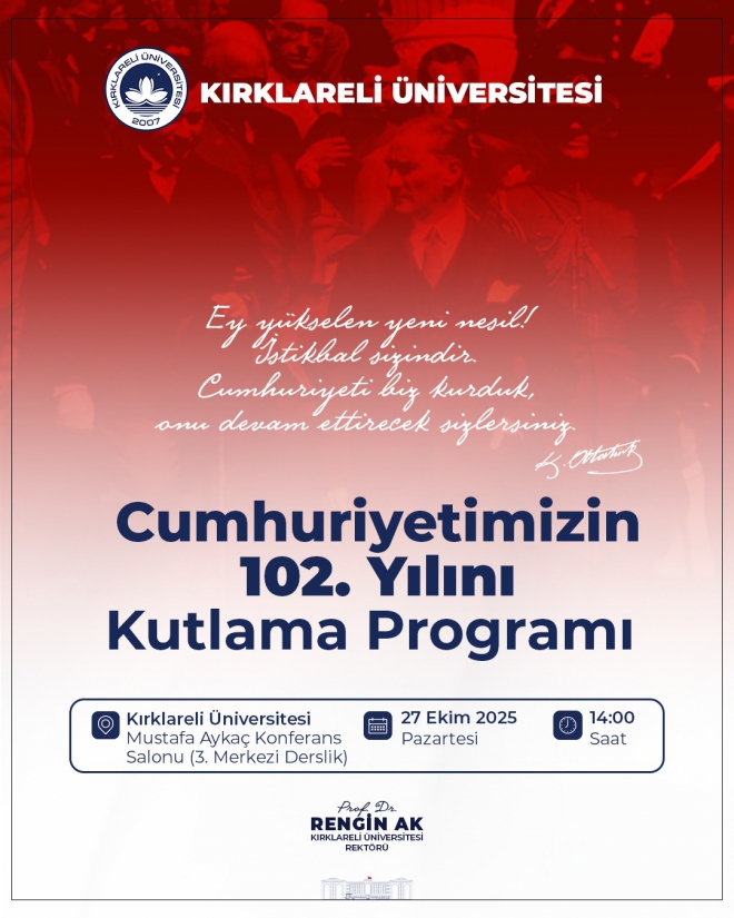 Kırklareli Üniversitesi olarak düzenlediğimiz Cumhuriyetimizin 102. Yılı Kutlama Programına; öğrencilerimiz, akademik ve idari personelimiz davetlidir.