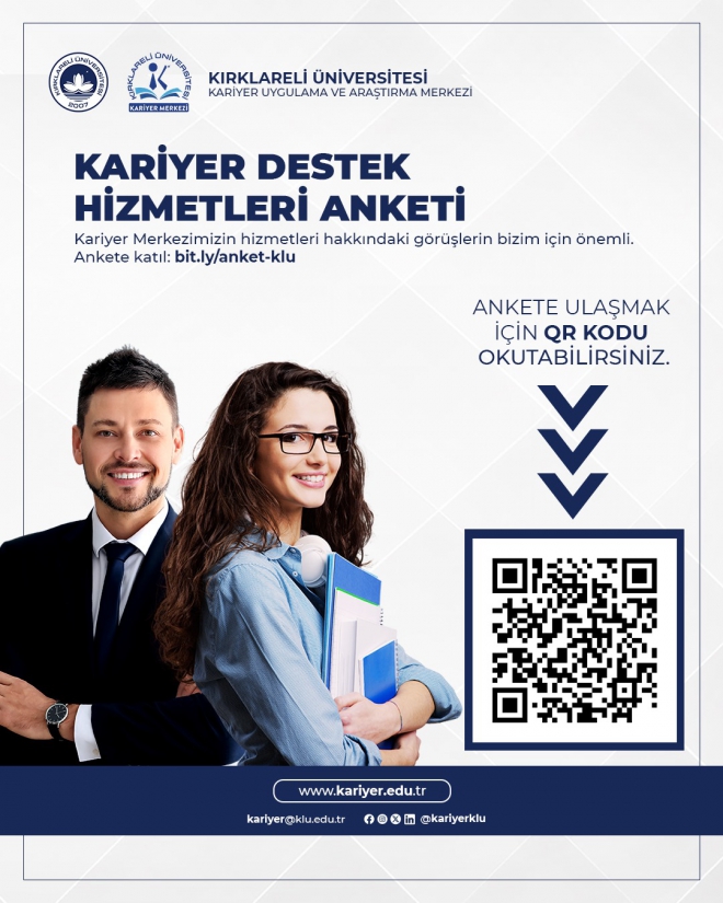 Kırklareli Üniversitesi Kariyer Uygulama ve Araştırma Merkezi tarafından, kalite geliştirme faaliyetleri kapsamında “Kariyer Destek Hizmetleri Memnuniyet Anketi” hazırlanmıştır.