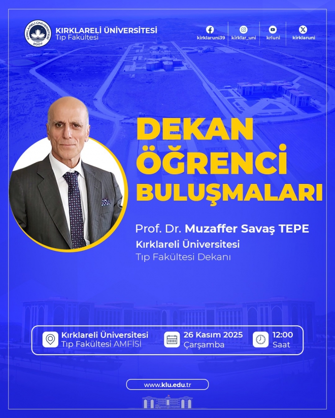 Fakültemiz tarafından düzenlenen “Dekan–Öğrenci Buluşması” etkinliği, 26 Kasım 2025 Çarşamba günü saat 12.00’te, Fakültemiz amfisinde, Dekanımız Prof. Dr. Muzaffer Savaş TEPE’nin katılımıyla gerçekleştirilecektir.